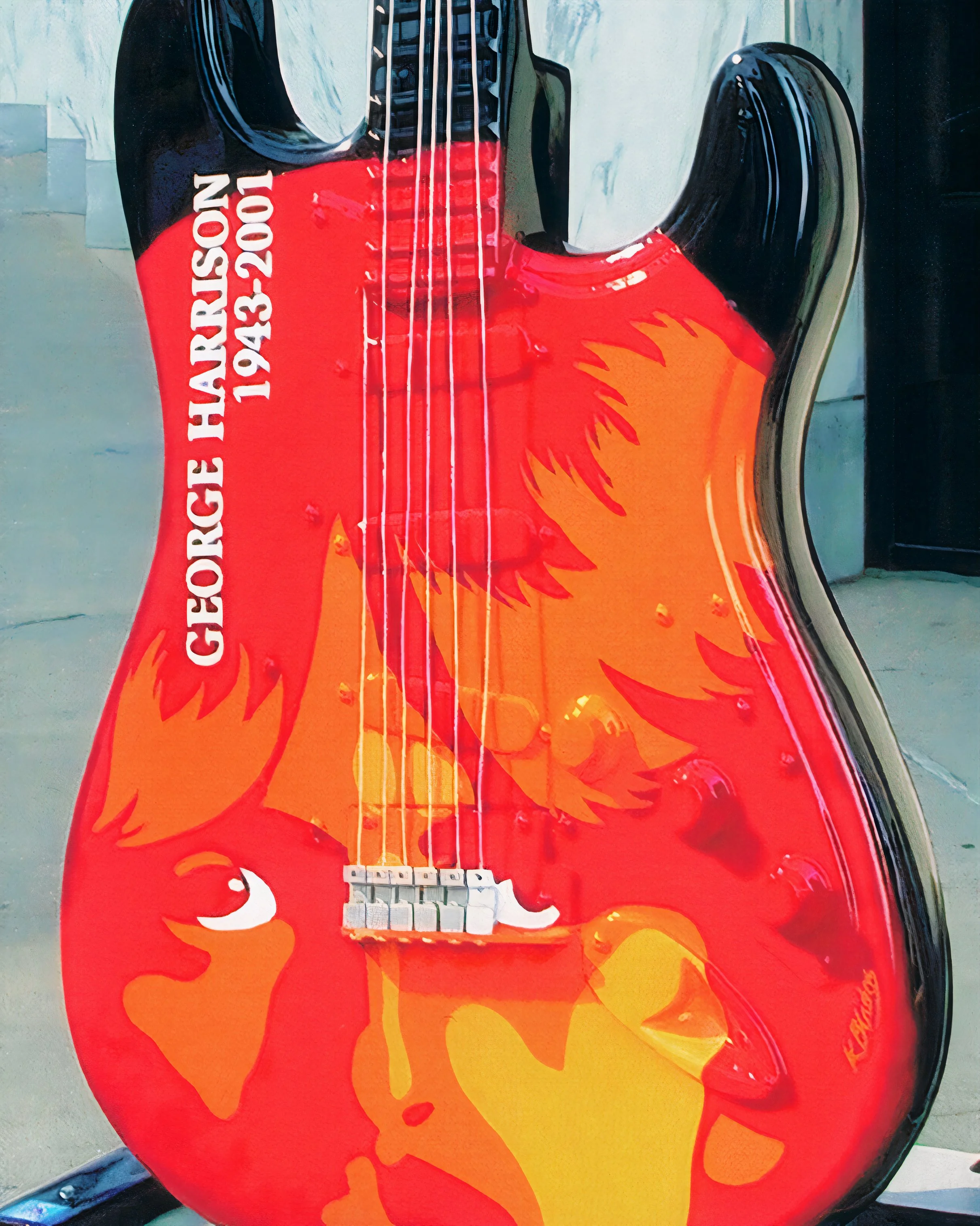 A striking tribute to George Harrison (1943–2001), this vibrant piece captures the quiet power and emotional depth of the late Beatles guitarist. Artist Karen Blados, known for her photo-realistic style using graphite and watercolor, collaborated with the Arras Creative Team to design a guitar that blends warmth, nostalgia, and reverence. Harrison’s iconic face emerges from warm orange and red hues, his eyes gazing upward—perhaps toward the “Here Comes the Sun” sky.