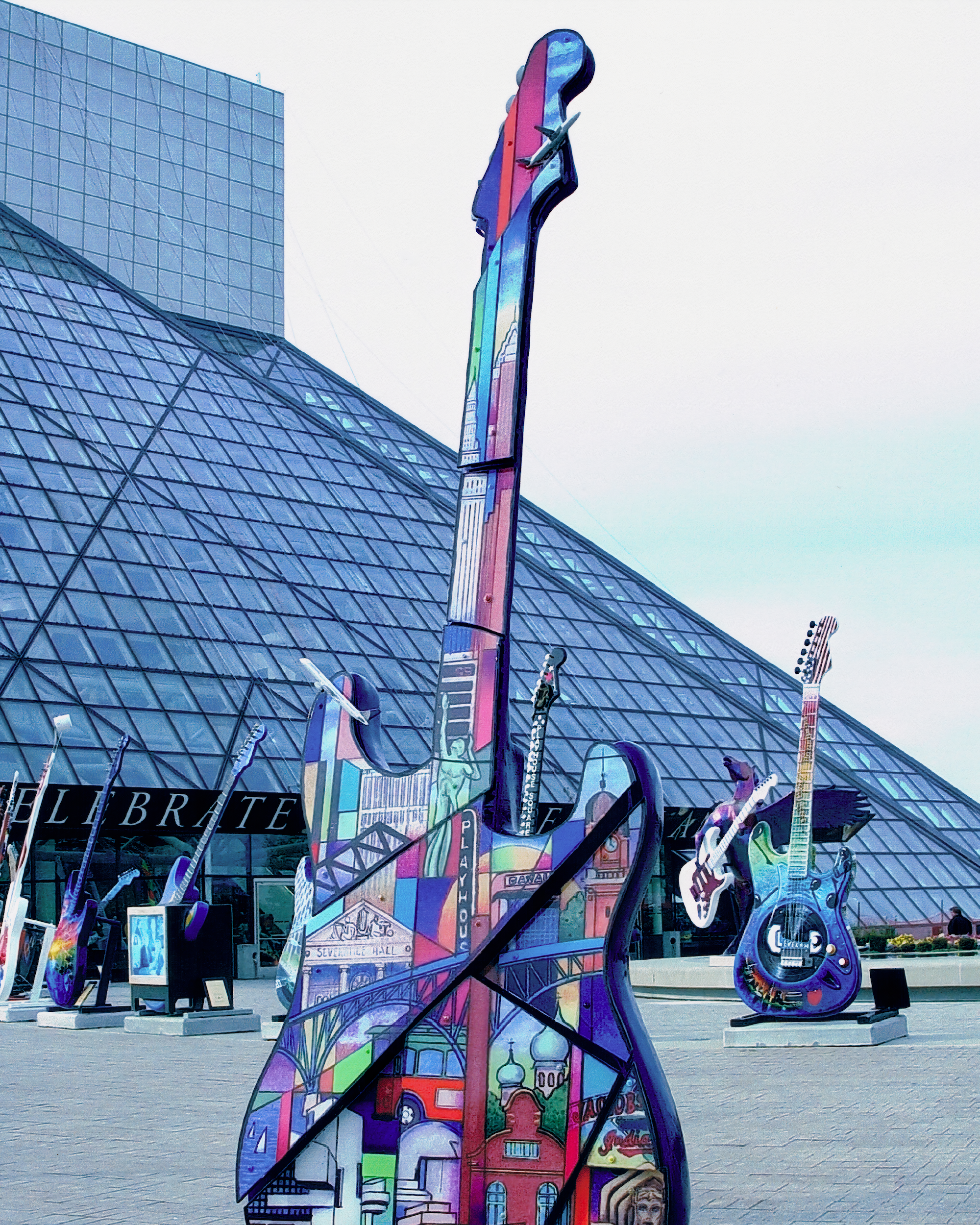 Sponsored by the Convention and Visitors Bureau of Greater Cleveland, the piece reflects the city's growth as a destination for travel, tourism, and the arts. From domes to smokestacks, skylines to cultural buildings, Vega’s signature cubist montage style turns the guitar into a stained-glass-like mural of a city on the move.