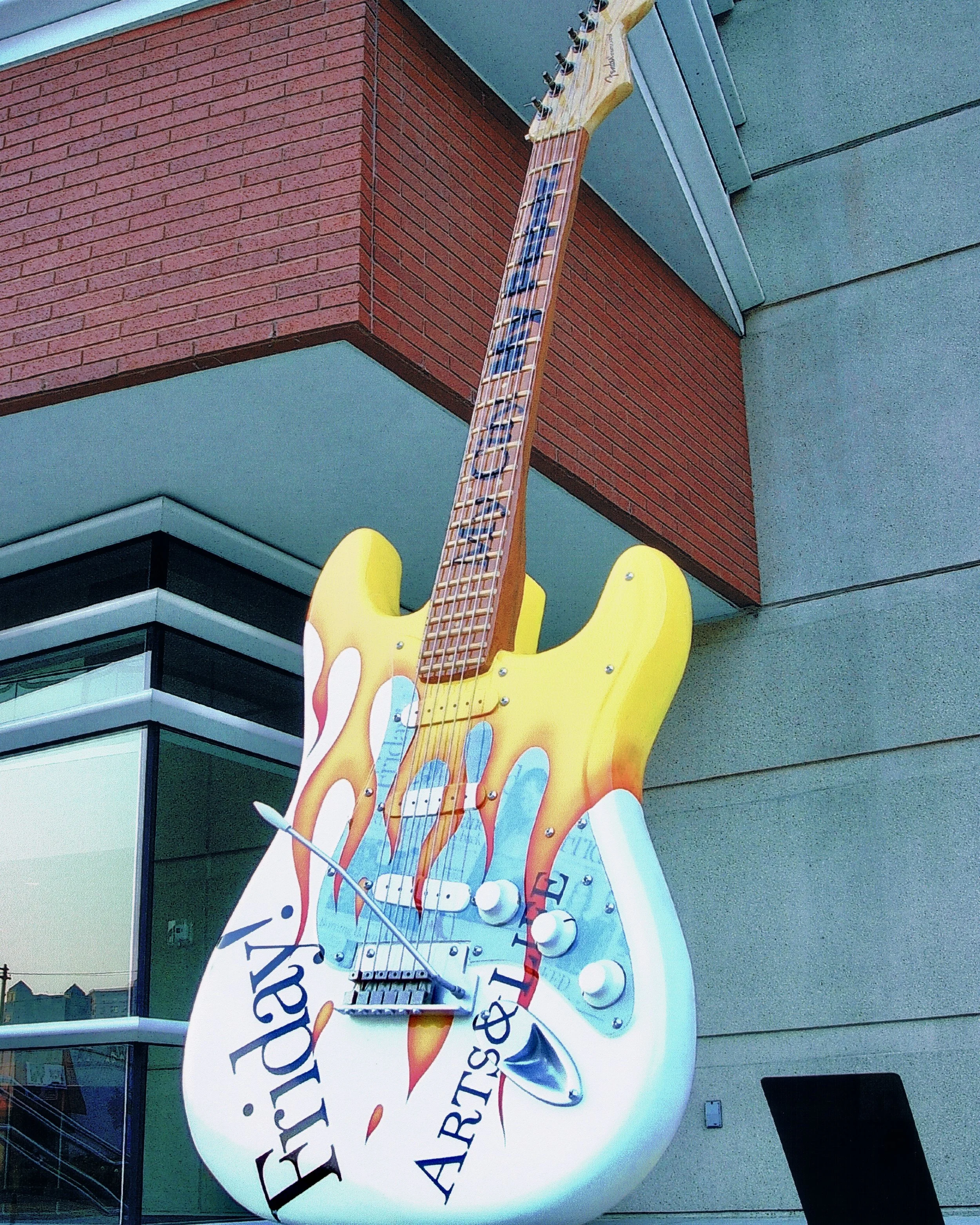 The guitar incorporates real printing plate textures and references to the paper’s beloved “Friday: Arts & Life” section—a go-to source for concert listings, cultural events, and entertainment features. The flame motif radiating from the pickups captures the electric anticipation of Friday night in Cleveland.