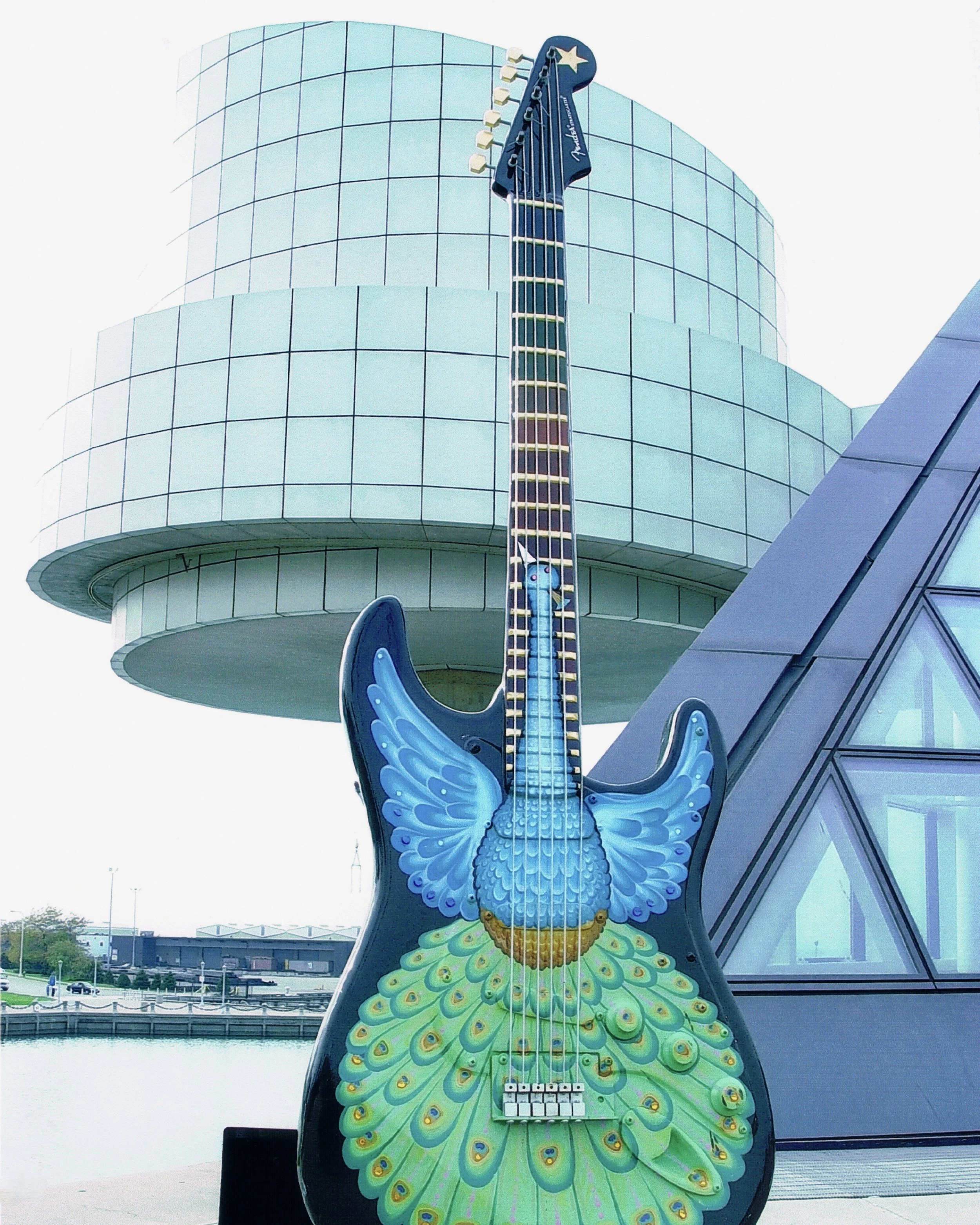 Artist Martin Boyle’s “Proud” transforms the iconic Fender Stratocaster shape into a visual celebration of beauty, heritage, and public pride. The design—a majestic peacock rendered in rich, layered greens and blues—evokes timeless themes of self-expression and transformation. Commissioned in 2002 for Cleveland’s GuitarMania series, the piece was later acquired by Key Bank and displayed near the city’s Free Stamp sculpture as a tribute to the region’s creative energy.