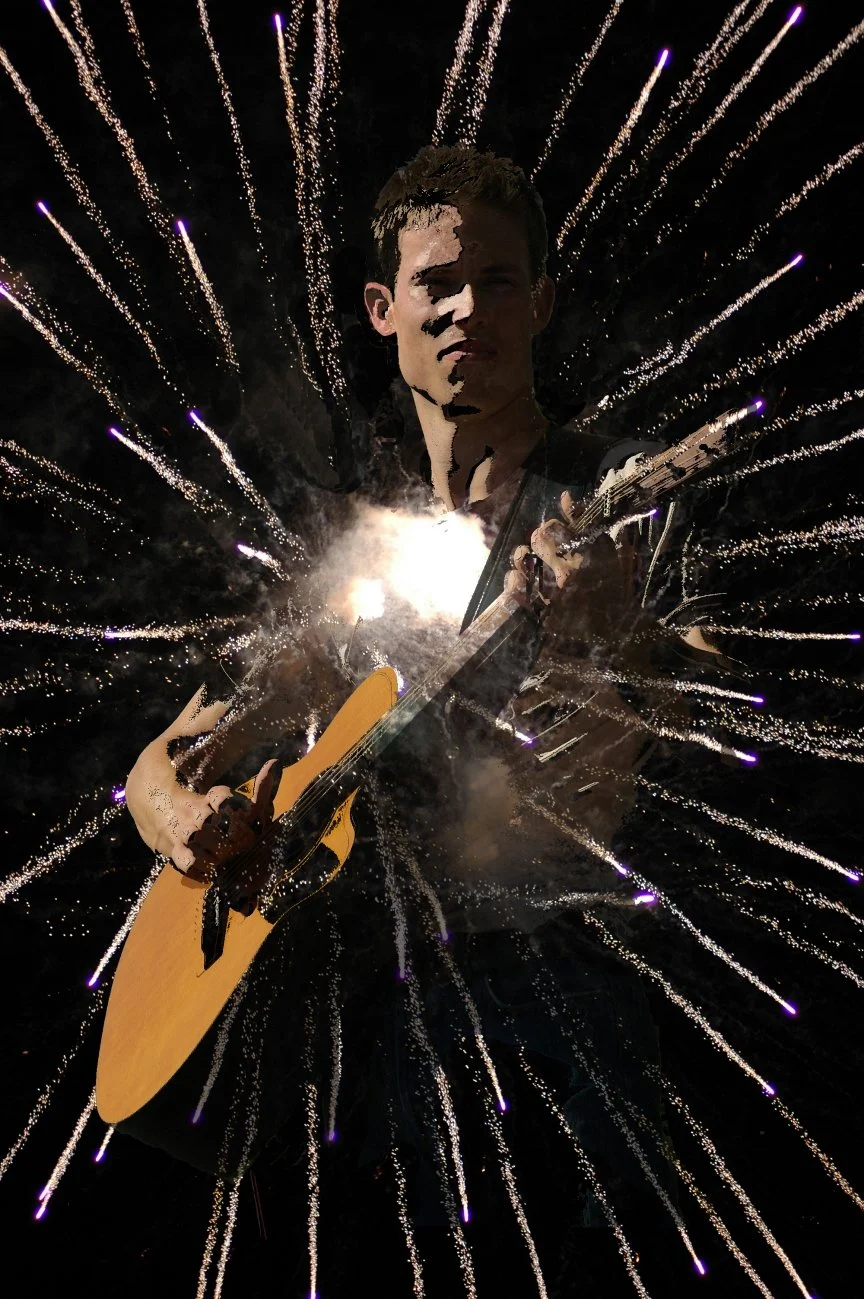 To show the progression from then to now, I include this image from my Fireworks series—created roughly thirty years ago—where I combined live musical performance with layered fireworks imagery using early Photoshop techniques. At the time, I didn’t have the language, the tools, or the resolution to fully realize what I was reaching for. I was cutting, isolating, recombining—removing bodies, breaking forms, letting energy exist without its original container.